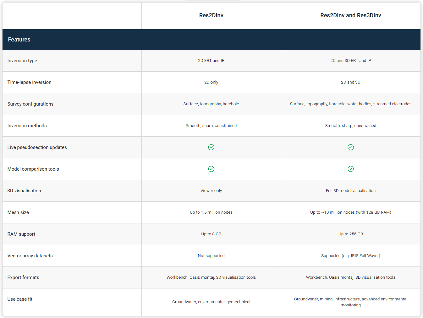Questo pacchetto include tutte le funzionalità di Res2DInv, oltre a funzionalità complete di inversione e visualizzazione 3D. Supporta set di dati 3D reali e linee di rilevamento 2D combinate, con opzioni per l’inversione time-lapse, set di dati vettoriali e gestione di mesh di grandi dimensioni.